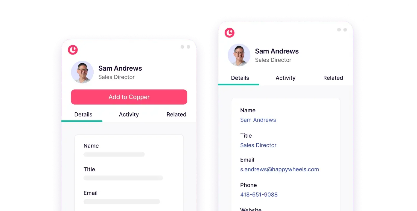 Copper automatically enriches contact profiles with up-to-date company information, social profiles, and more.